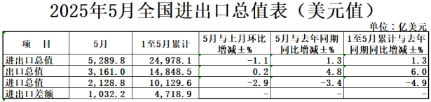 2025年1-5月,我国进出口总值2.5万亿美元,增长1.3%。其中,出口1.48万亿美元,增长6.0%;进口1.01万亿美元,下降4.9%
