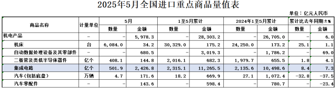 2025年1-5月,我国出口集成电路5264亿元,增长18.9%;进口集成电路11265.5亿元,增长7.3%